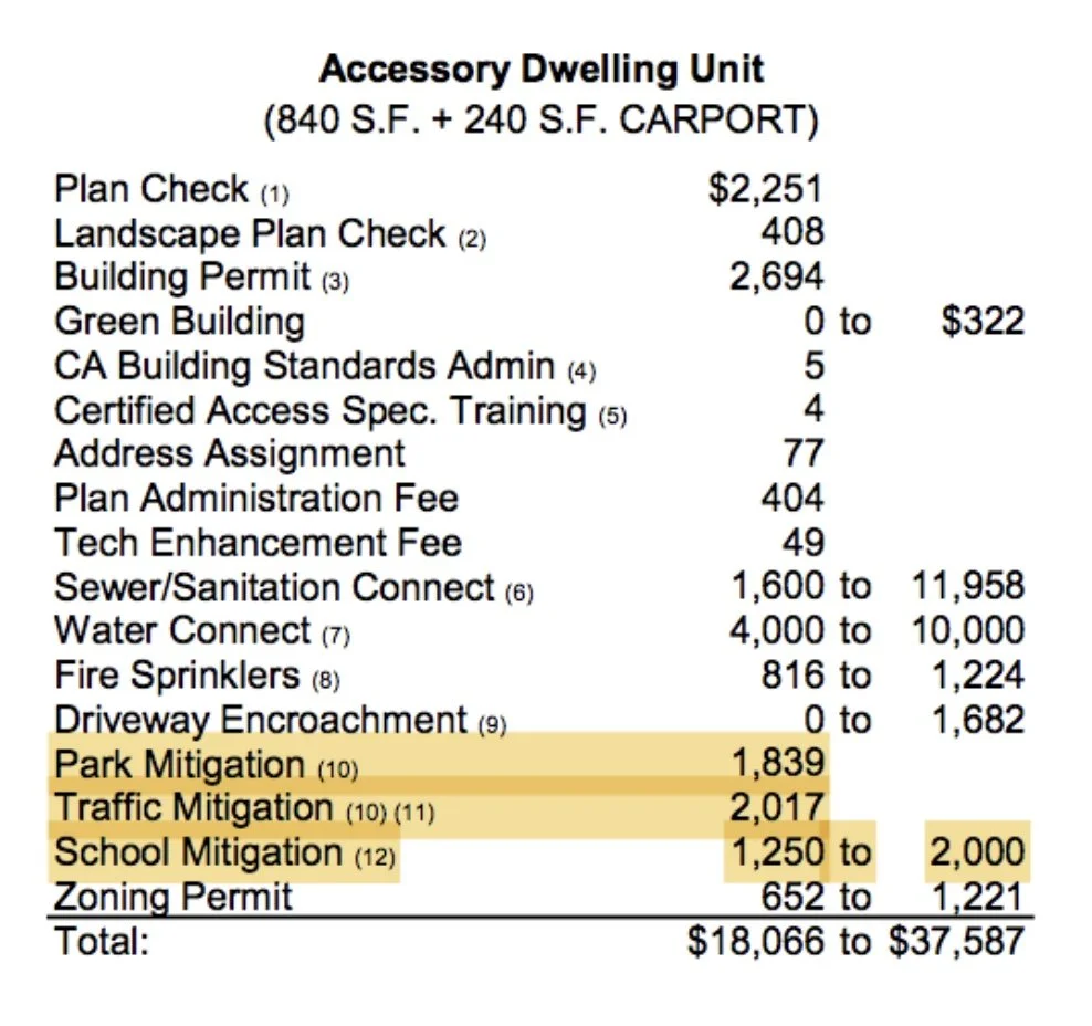 In AB 68 (one of the big pieces of legislation that streamlined the ADU rules across the state starting in 2020), “impact fees” are defined:
